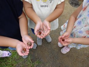 園庭遊びではどんぐり探しに夢中な子どもたち!木になっているどんぐりを探したり、帽子のついたどんぐりを見つけ、大切そうに握りしめていました♪