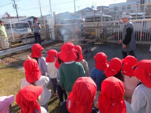火が少し弱まってきたので保育者と一緒に近くに見に行き煙を浴びみんなで無病息災を祈願しました。